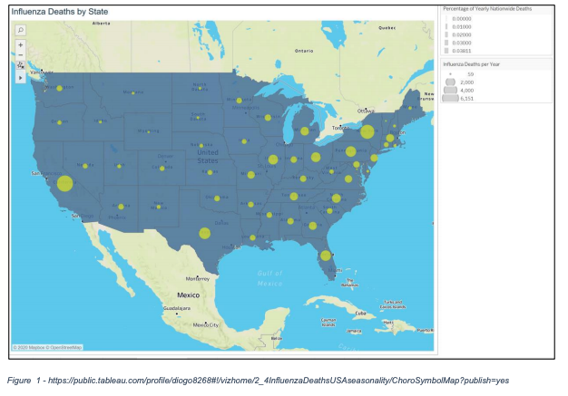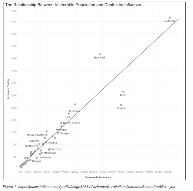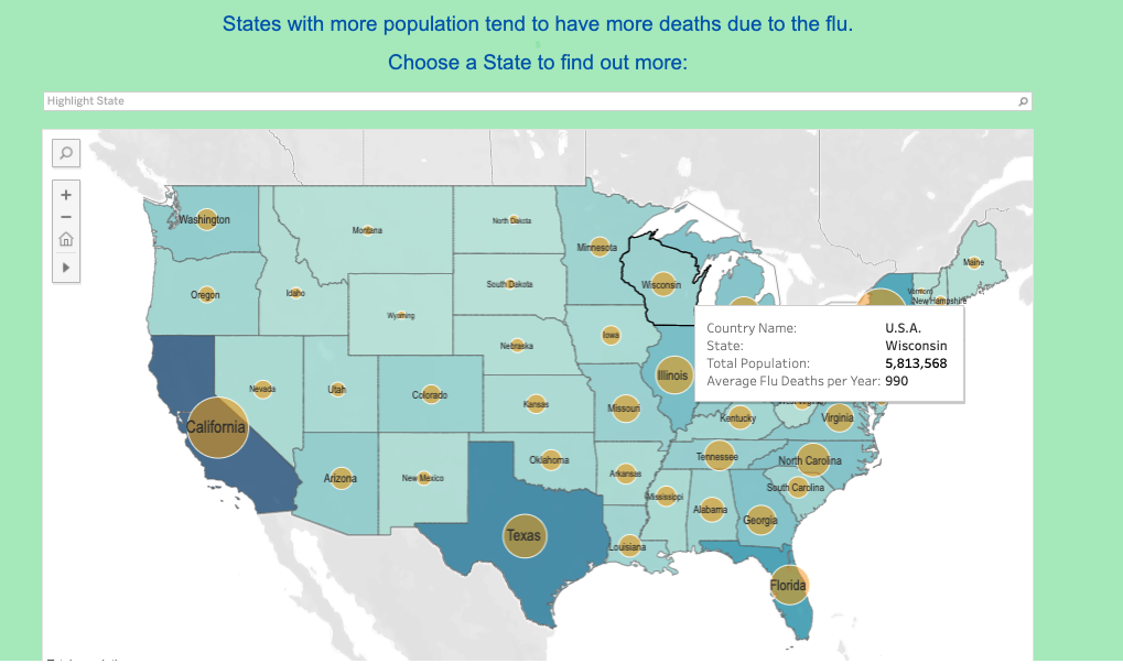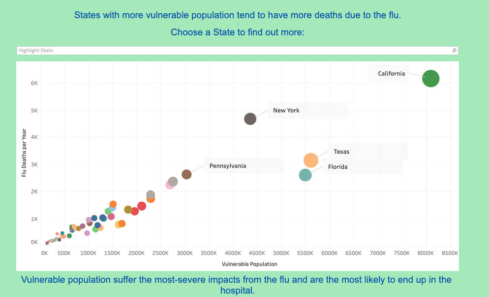 The data shows that states with more population, and therefore more vulnerable population, have more deaths due to the flu. Vulnerable populations suffer the most severe impacts from the flu and are the most likely to end up in the hospital, determining the need for increased medical personnel.
