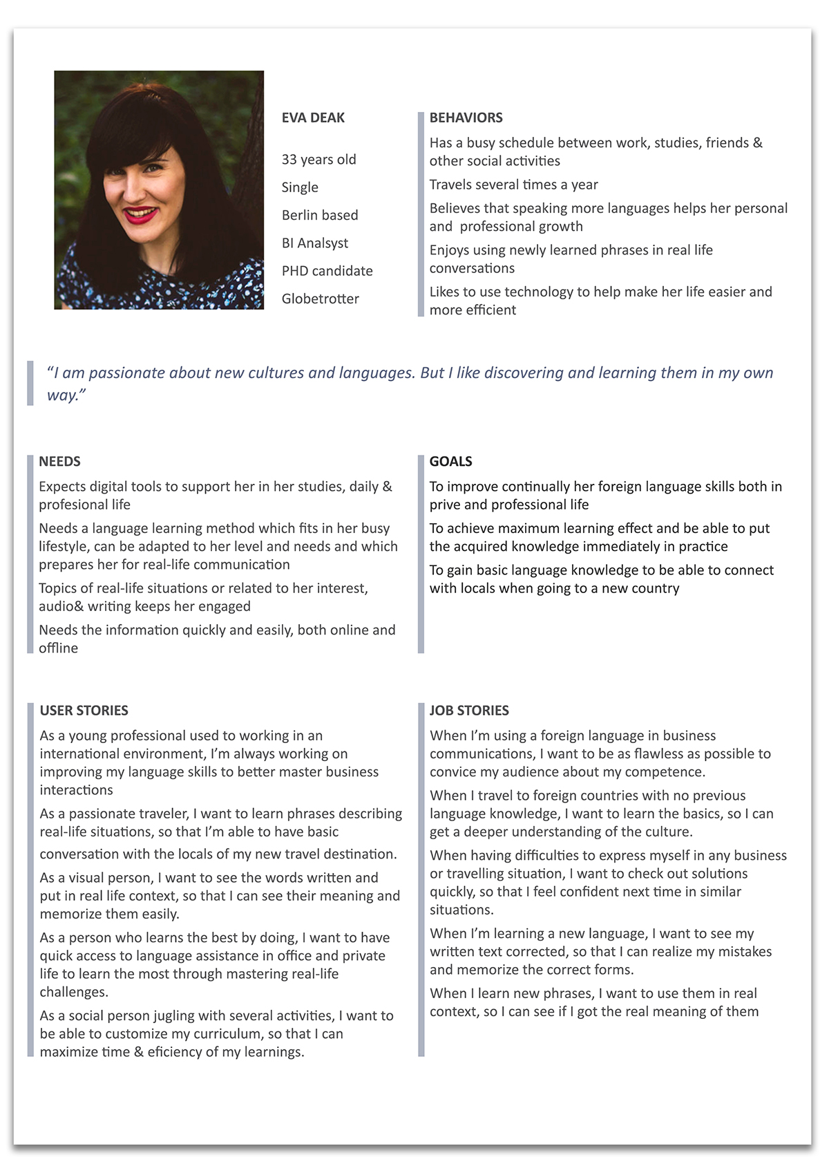 Based on my user research my user persona Eva was born. She helped me to craft the problem statement, design possible solutions and guided me through the design process.