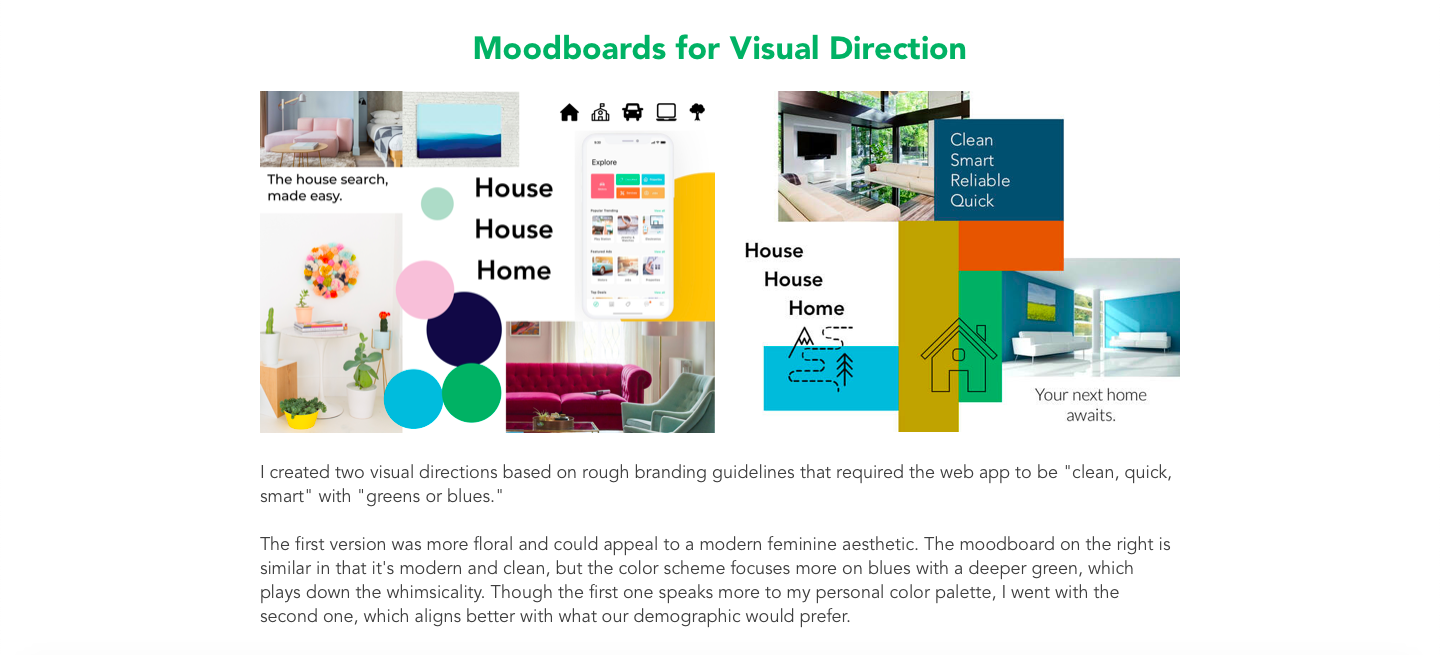 I’m happy with how much of my personality I was able to infuse into the design! Even though it’s a student project, it’s still near and dear to me. The nice thing about the portfolio projects I did with CareerFoundry is that I had complete ownership of the design, branding, and visual identity. In the case of House House Home, I thought creating the mood boards was a fun exercise that I ought to fit more into my current design process. There are so many roads one can go down when designing, so the process that CareerFoundry taught in the UI for UX Course helped give the project a.