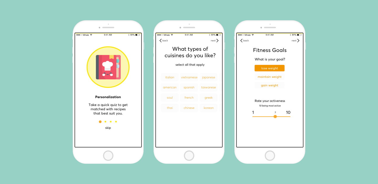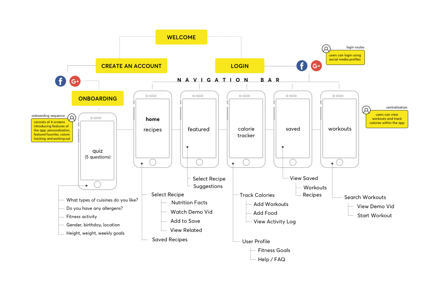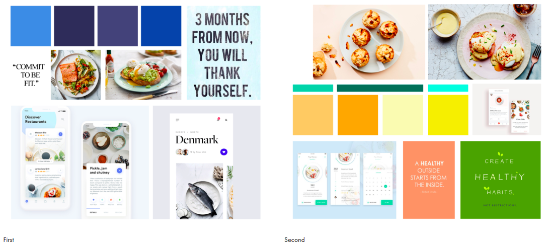 I created two mood boards as a guiding principle for my target market. The first moodboard channels a light, simple, minimalistic feel similar to MyFitnessPal. The second channels a welcoming, inspiring feel. Although blue is said to be more relaxing, I decided to choose orange and green to focus on motivation and inspiration, as those colors are intended to represent. I’m a big fan of user psychology, so any chance I get to test my hypothesis on color choices, I’m there. After conducting A/B testing for mood boards: