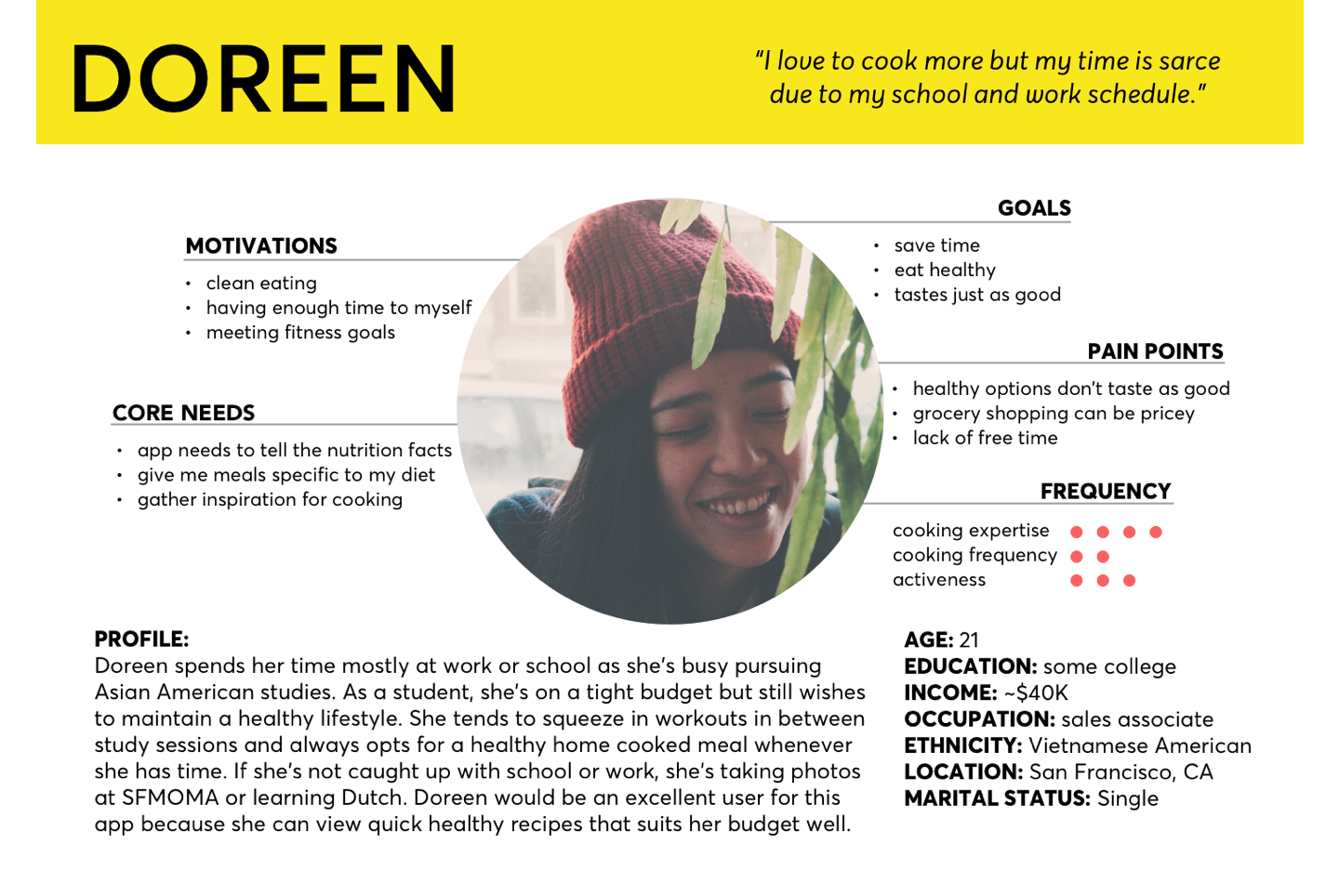 Throughout the interviews, I noticed that the majority of participants had an interest in adopting a healthy lifestyle but don’t stay motivated enough to commit to one app. I asked how they would feel if an app was created which gave personalized options and also had a calorie tracker as one of its features, and all participants said they would be willing to use it. One participant also said they would be more engaged with it if it had a “personal coach” or “trainer.” After analyzing their answers, I started to combine different workout elements from apps on the market. I also created three personas for the app to help navigate my design process and understand their needs. Below is one of them.