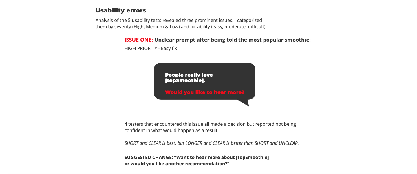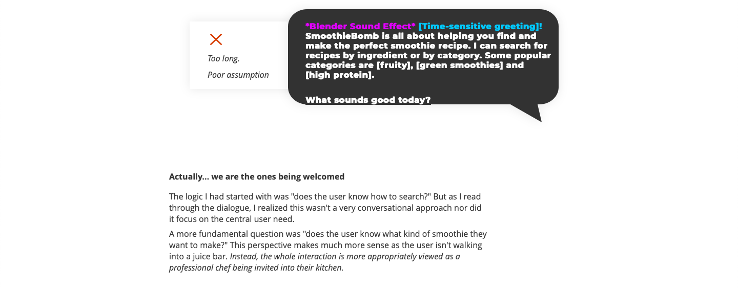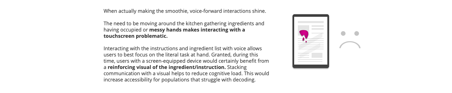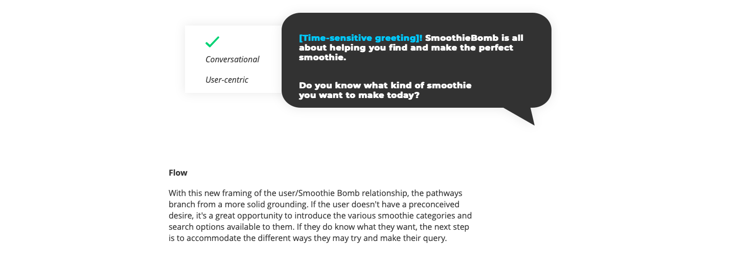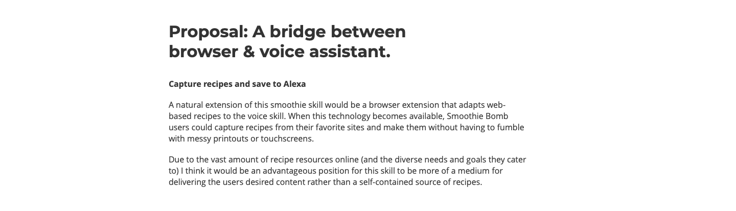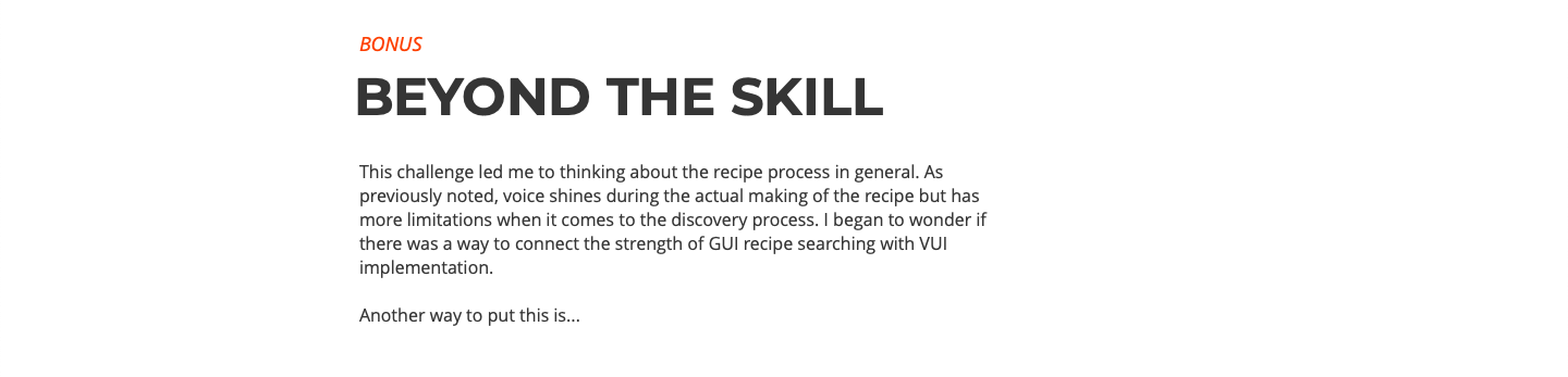 My VUI experience was awesome (shout out to my mentor, Ilana!) VUI/Conversational design really makes you focus on user-testing because, unlike screen design, you can’t just look at your design and go, “yeah, that makes sense.” When writing your script and flow, you’re basically already at the high-fidelity stage (expect for your voice sounding a little less robot-y) so you can get great results from testing right away.