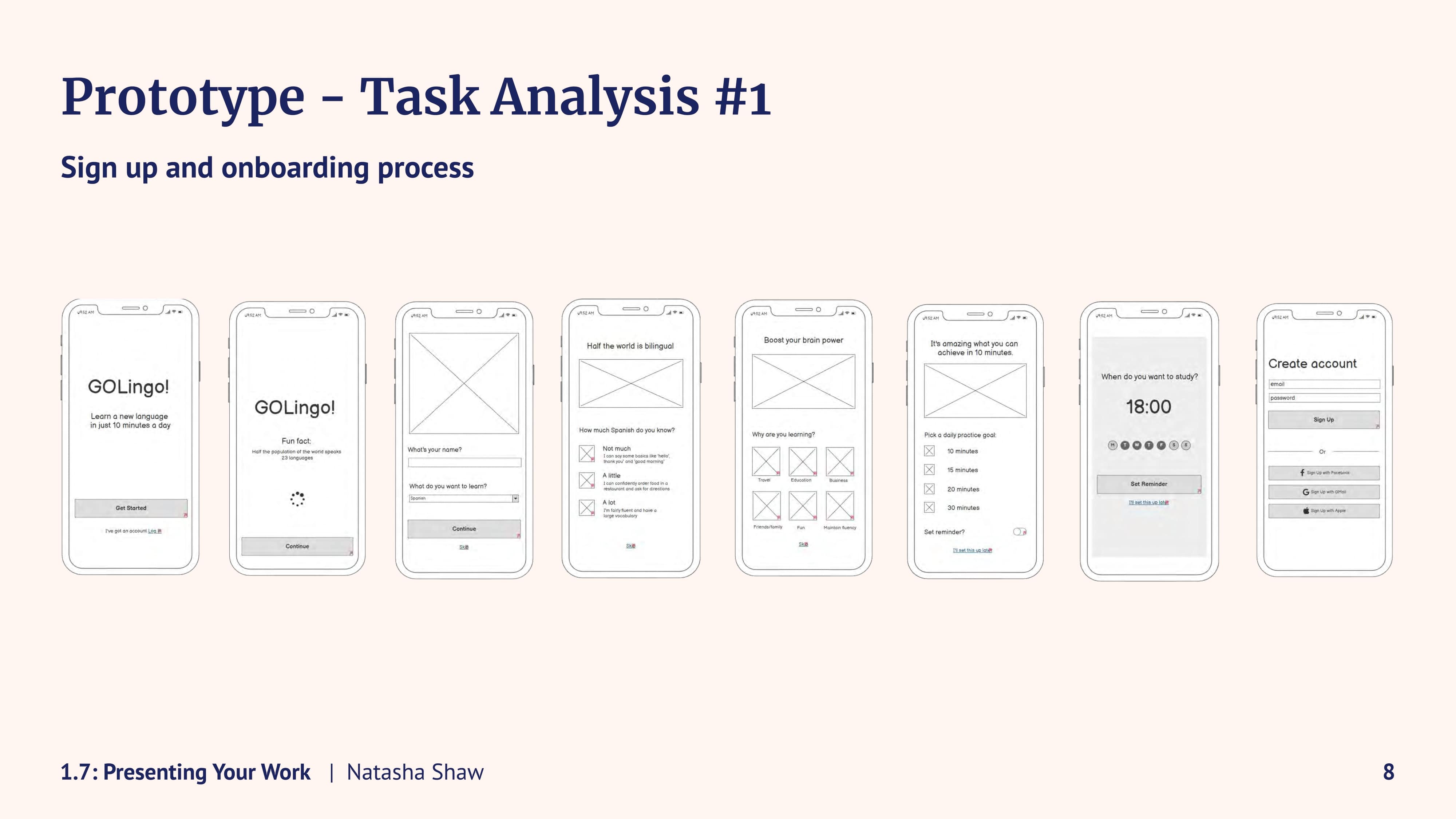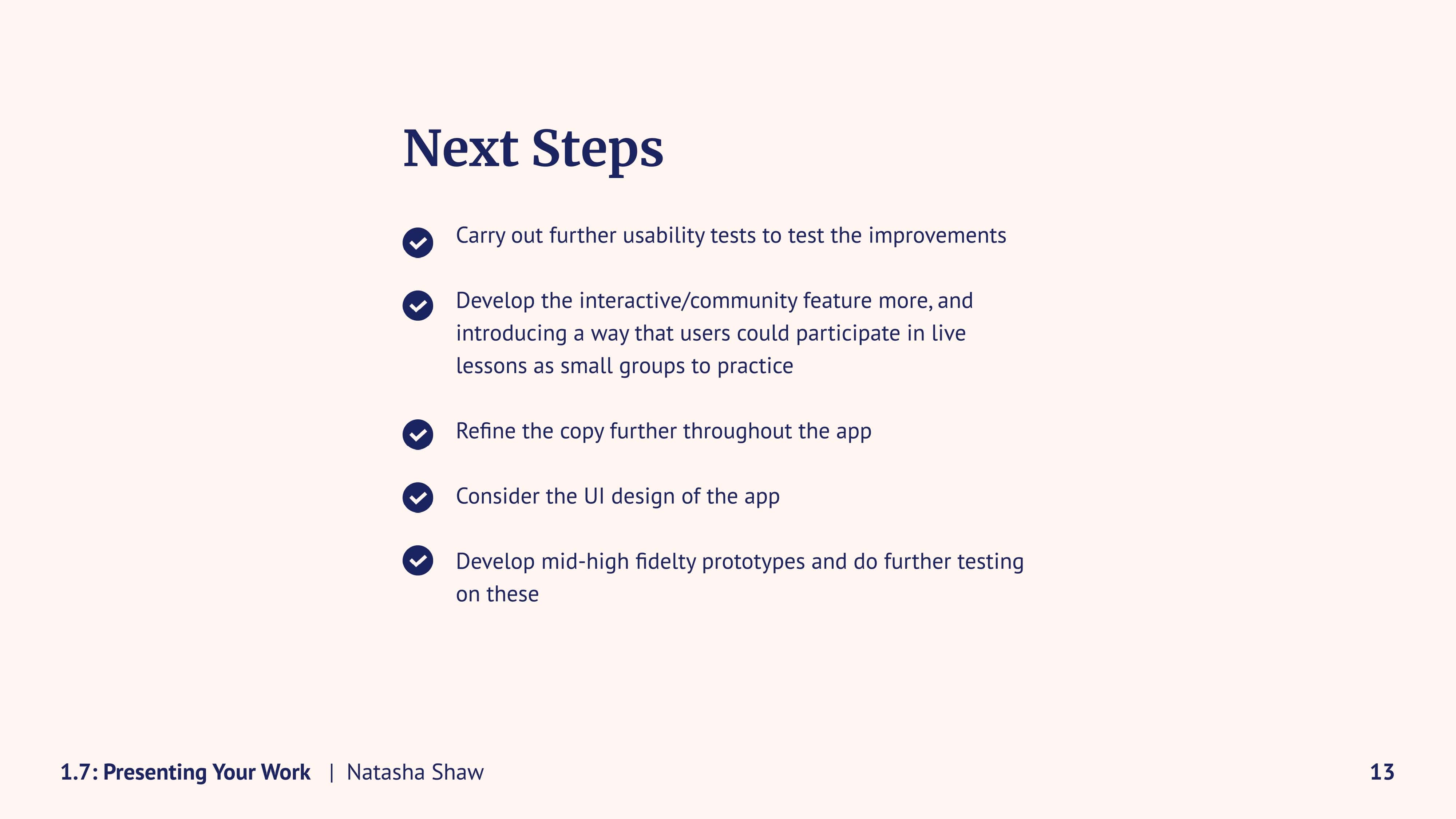 I enjoyed applying what I had learned in each task as I went along, this helped me learn much more effectively. Personally, I enjoyed developing my understanding of the UX design thinking process throughout the project; that was more important to me than having a complete app design at the end.