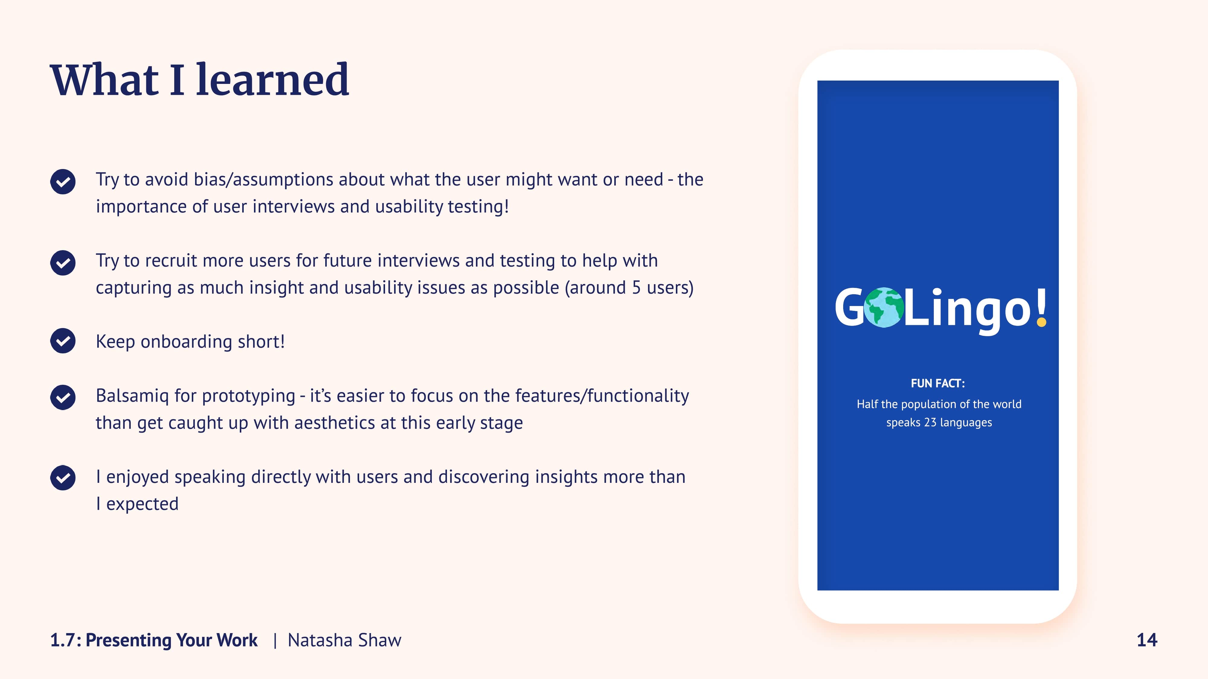 During the CareerFoundry Intro to UX Design Course, you’ll build out a job-ready project for your portfolio. Here is a breakdown of graduate Natasha’s language learning app project, GoLingo! If you’d like to see more of her work, head to her website.