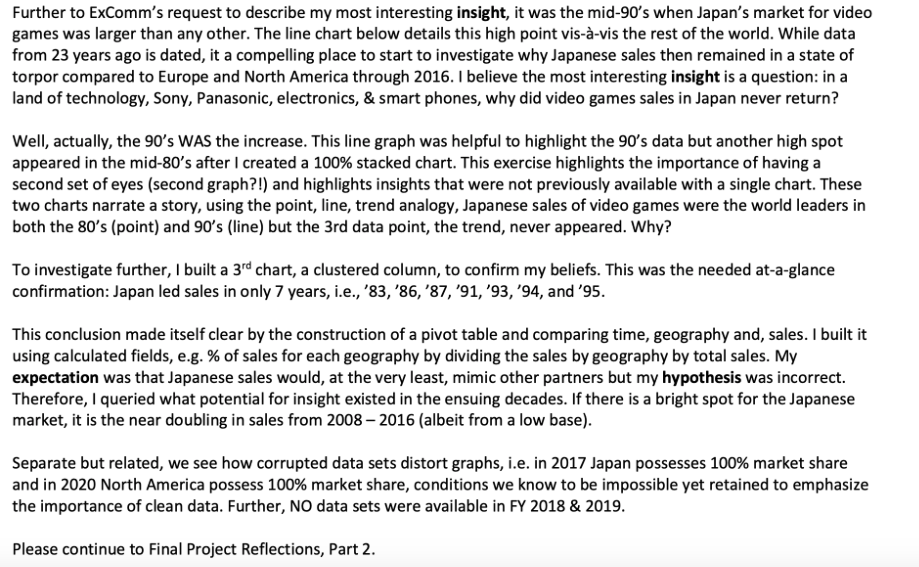 More generally, this course allowed me the opportunity to step back and acknowledge the strategic value of analytics in removing phrases like, “I think,” “I guess,” “it seems,” and replacing them with “the data correlate,” “based upon the trends,” and “the analysis forecasts.” I appreciate the ability to present quantitative analyses that can be utilized to make objective, data-driven decisions.