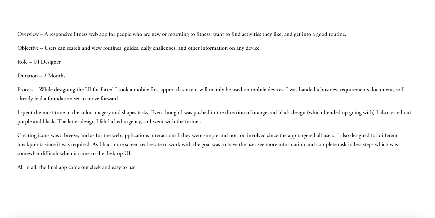 Below, Pernell maps out the design thinking process for his portfolio project “Fitted”; a responsive fitness app for the web.