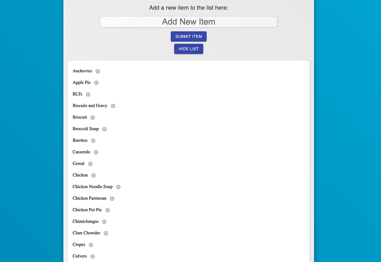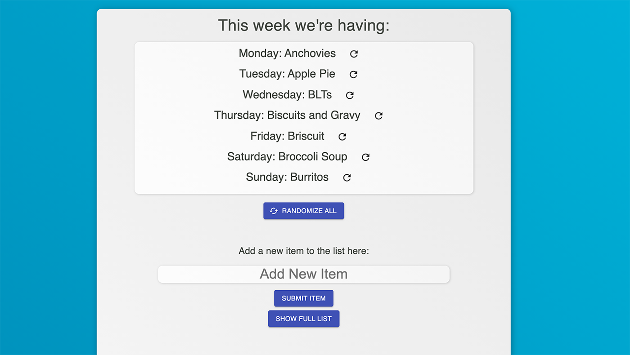 “I built a meal-planning app that provides inspiration to users on what kinds of meals they can prepare throughout the week. It presents a list of randomized meals that correspond with each day of the week. I built it with React.js and the database is built in Firebase. I wanted to build it because meal-planning at the beginning of the week is one of my least favorite activities, so I wanted something that could do it for me with the click of a button.”