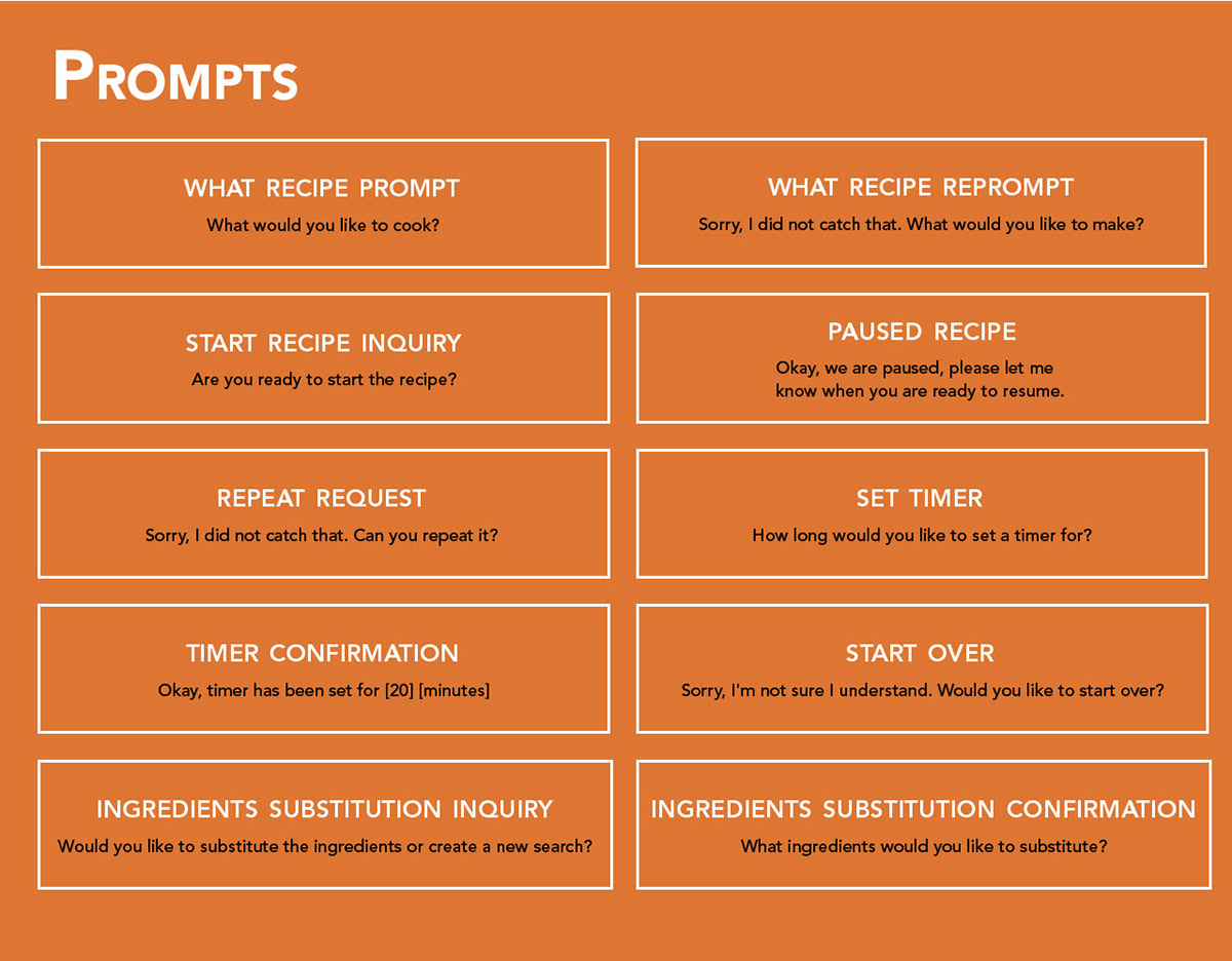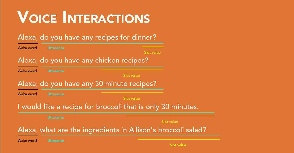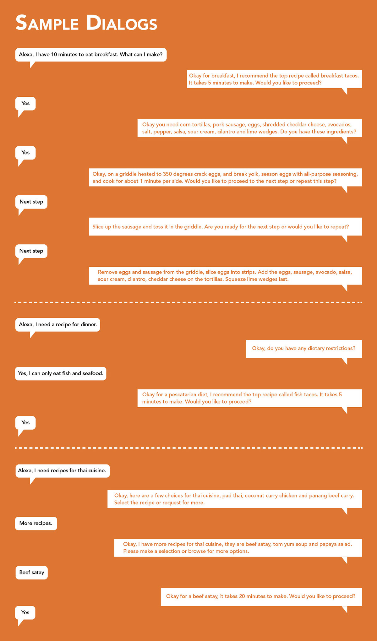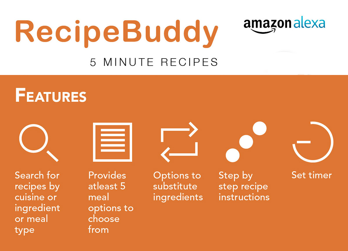 RecipeBuddy is a voice assistant that provides cooking assistance for the kitchens of today’s society. Books and digital devices are not helpful as cooking requires the use of both hands. The chef is not always able to turn the page or scroll on a screen for further instruction. Cooking videos and cooking shows are not helpful either. The culinary host may be moving too quickly for the viewer to keep up with or the viewer’s eyes need to focus on their immediate task. Voice user interfaces are an excellent solution for this problem as they can dictate out loud the recipe directions at a steady pace while the cook can focus on their culinary task.