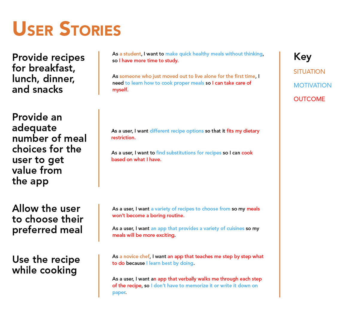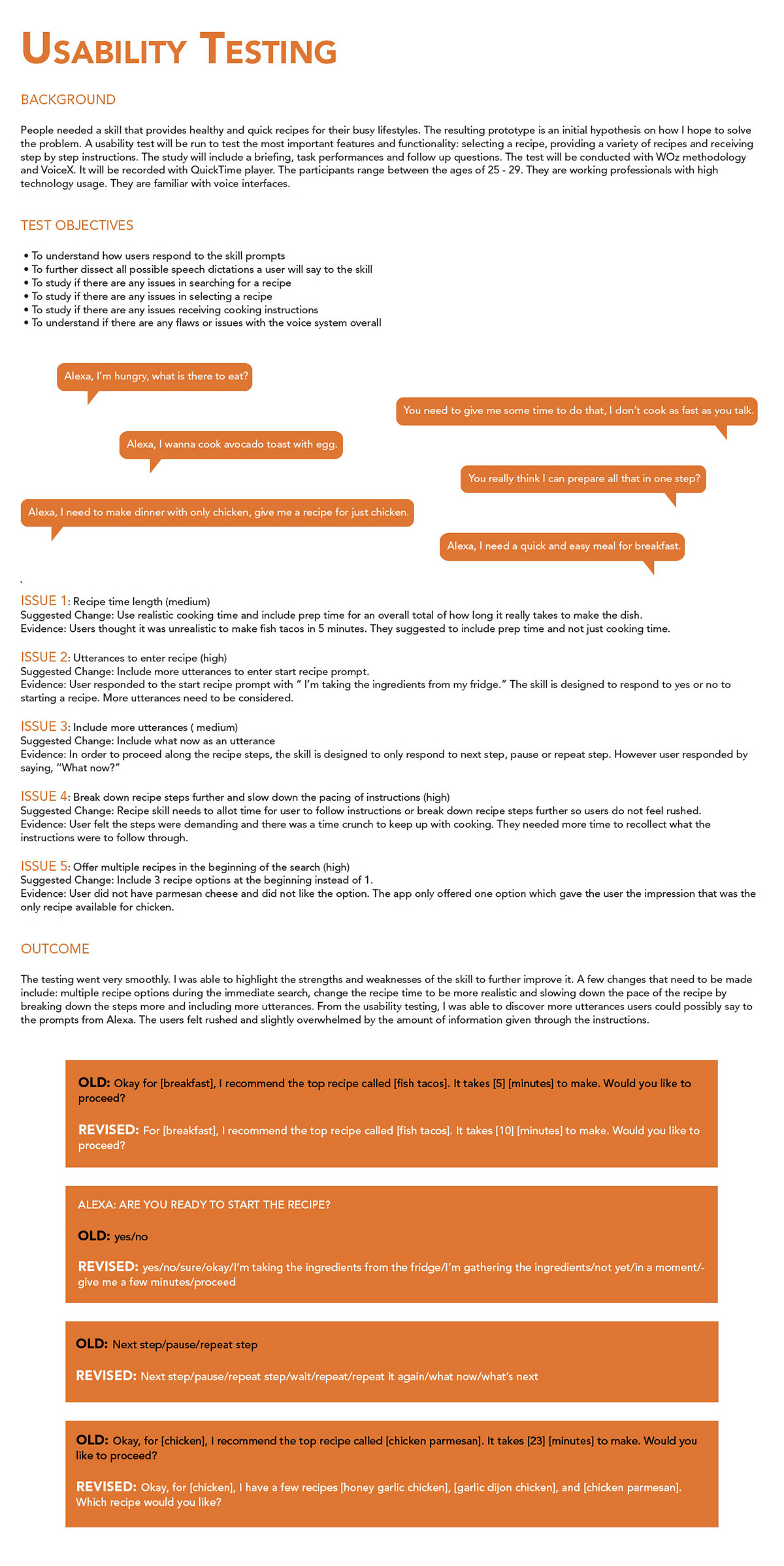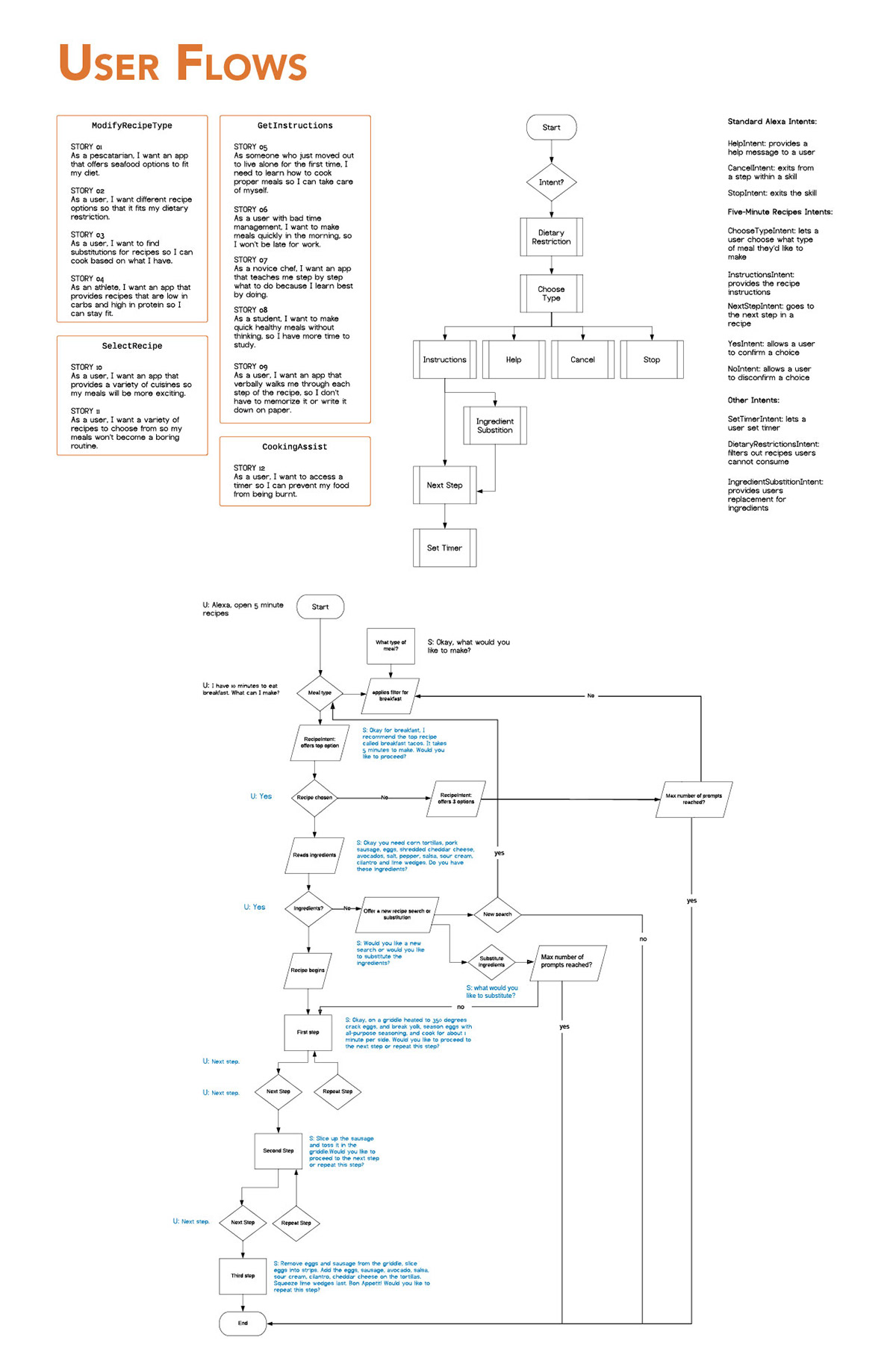 RecipeBuddy is a voice assistant that provides cooking assistance for the kitchens of today’s society. Books and digital devices are not helpful as cooking requires the use of both hands. The chef is not always able to turn the page or scroll on a screen for further instruction. Cooking videos and cooking shows are not helpful either. The culinary host may be moving too quickly for the viewer to keep up with or the viewer’s eyes need to focus on their immediate task. Voice user interfaces are an excellent solution for this problem as they can dictate out loud the recipe directions at a steady pace while the cook can focus on their culinary task.